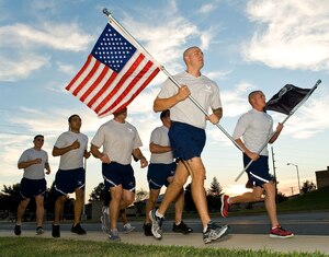 "The flags don't stop moving; keep the flags moving when you hand them off," commanded one of the runners between panting breaths. The jogging formation approached their replacements, who likewise began to jog. With both parties in motion, the flags were passed forward: first the American Flag, and