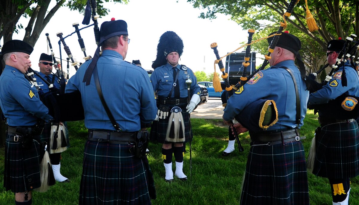 Members of the Delaware State Police Pipe and Drums Unit plays a song during a retreat ceremony May 17, 2013, at the 436th Airlift Wing headquarters building on Dover Air Force Base, Del. Law enforcement agencies from the state gathered with members of the 436th Security Forces Squadron to celebrate National Police Week and honor fallen police officers and their families. (U.S. Air Force photo/Airman 1st Class Ashlin Federick)