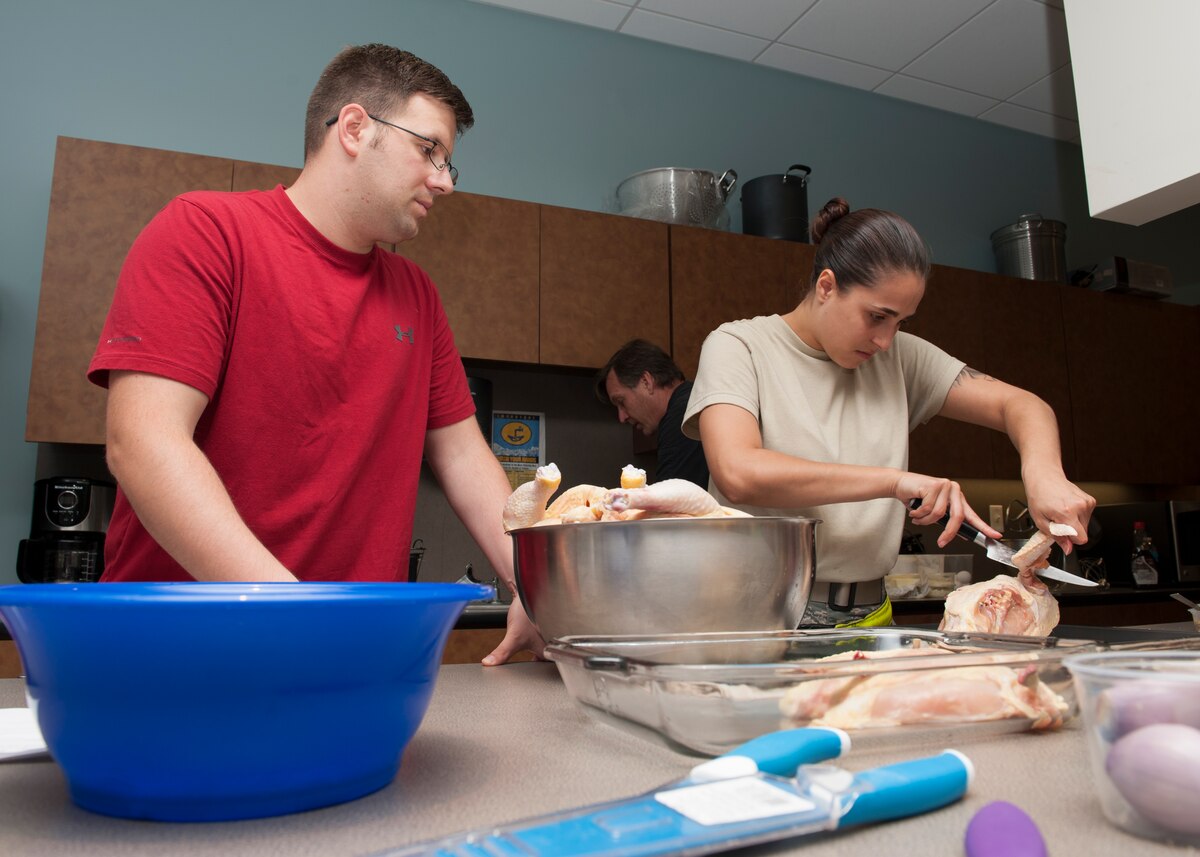 First Lt. James Aultman, 436th Mission Support Group executive officer, and Senior Airman Dominique Pascual, 436th Aerial Port Squadron cargo processor, debone raw chickens during a “Dorm to Gourm” Leadership Pathways Professional Development course Oct. 28, 2014, at the fitness center on Dover Air Force Base, Del. Course instructors taught the Airmen how to make a “not your momma’s chicken and dumplings” dish. (U.S. Airman 1st Class Zachary Cacicia)