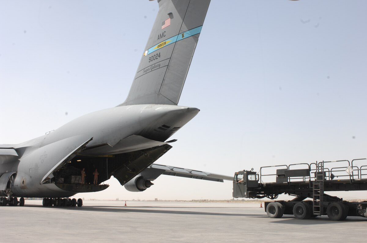 Airmen from the 451st Expeditionary Logistics Readiness Squadron Aerial Port Flight and 709th Airlift Squadron unload heavy supplies and equipment from a C-5M Super Galaxy at Kandahar Airfield, Afghanistan, Sept. 19, 2013. Many cargo loads and unloads require a team effort to move due to their weight and size. The 709th Airlift Squadron is part of the Air Force Reserve Command’s 512th Airlift Wing at Dover Air Force Base, Del. (U.S. Air Force photo story/ Senior Airman Jack Sanders)