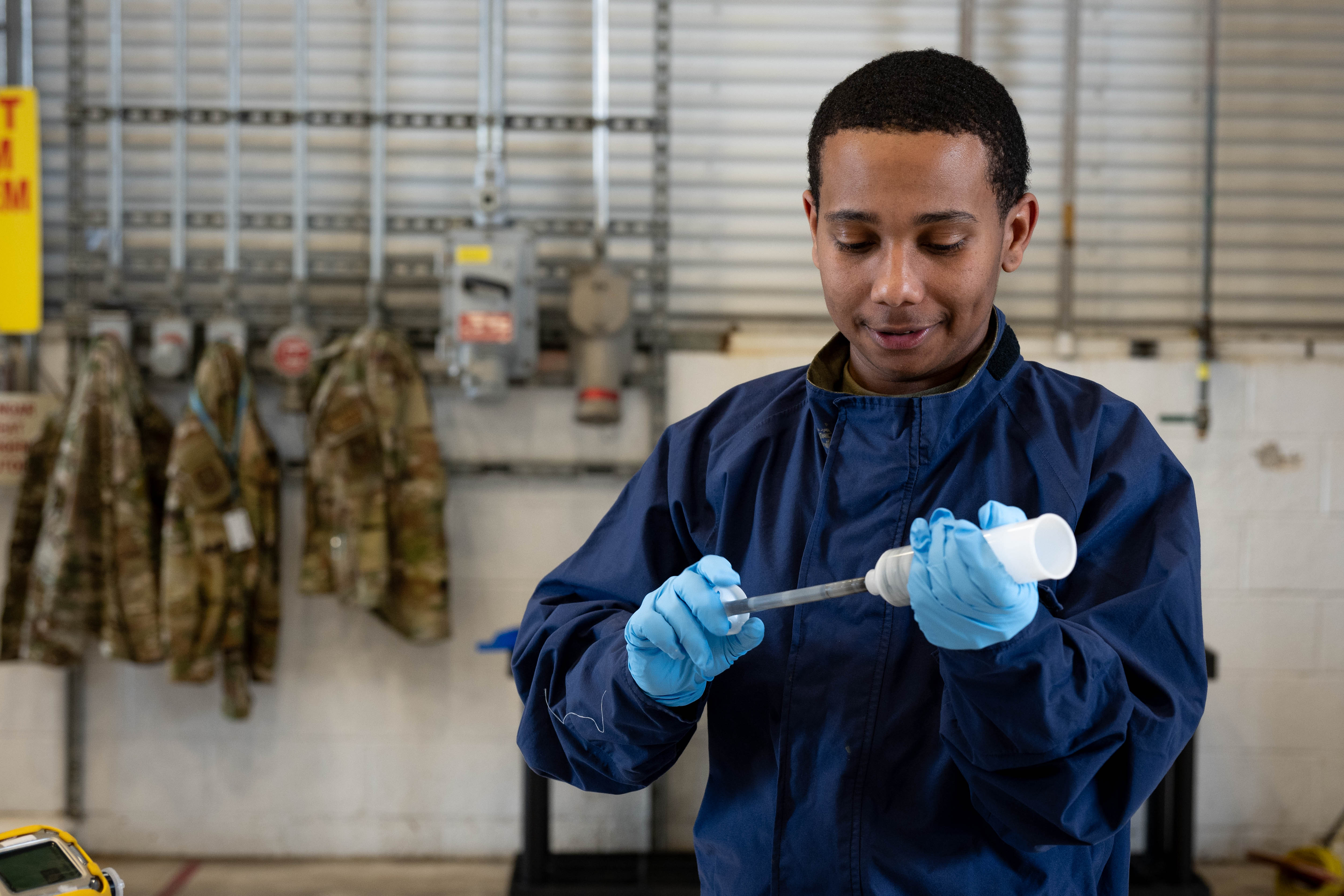 U.S. Air Force Master Sgt. Brad Schank, 436th Maintenance Squadron aircraft fuel systems section chief, holds a vial of sealant material during an aircraft fuel systems demonstration during a Dover Duties tour at Dover Air Force Base, Delaware, March 31, 2026. Specialized compounds are used to seal internal fuel tank components and prevent leaks under operational conditions. Airman 1st Class Mekhi Williams, 436th Communications Squadron network infrastructure technician, noted both career fields require identifying issues at their source and applying targeted fixes. Dover Duty tours highlight how technical expertise across units supports overall aircraft readiness. (U.S. Air Force photo by Senior Airman Keira Rossman)