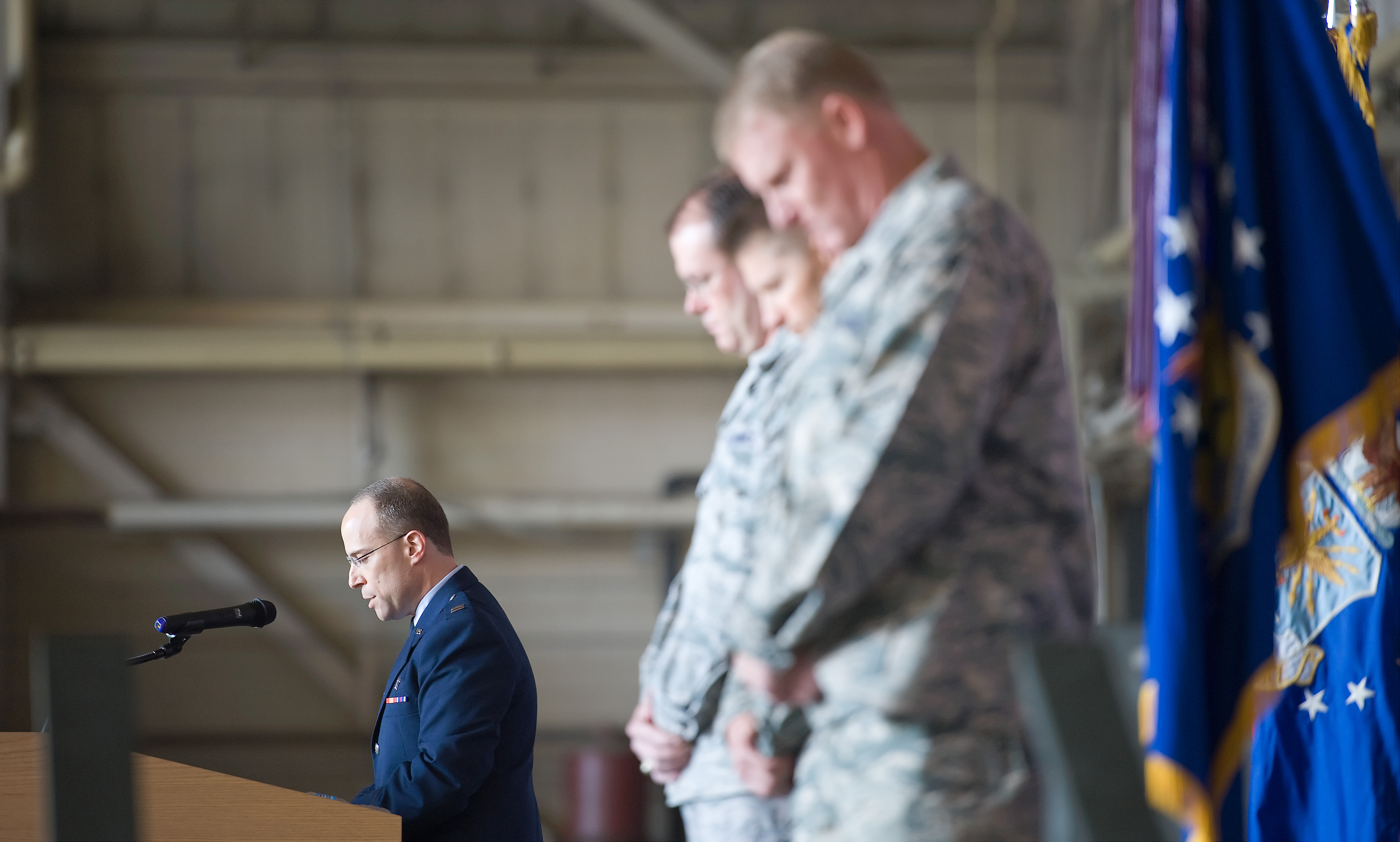 Captain Louis A. Mattina, a Chaplain with the 436th Airlift Wing gives the invocation while senior leaders from the 436th AW, the outgoing commander (middle) and incoming commander of the of the 436th Maintenance Group bow their heads during the Change of Command ceremony on June 20th, 2013 at Dover Air Force Base, Del. Col. Thomas J. Kauth relinquised command to Col. Charles S. Nesemeier in a ceremony officiated by Col. Richard Moore. (U.S. Air Force photo/Greg L. Davis)