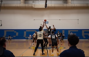 The 436th Aerial Port Squadron, right, and the 436th Security Forces Squadron, left, perform a jump ball at an intramural basketball game on Dover Air Force Base, Delaware, Jan. 22, 2026. Several squadron teams on base compete throughout the season, striving to be the season champions. (U.S. Air